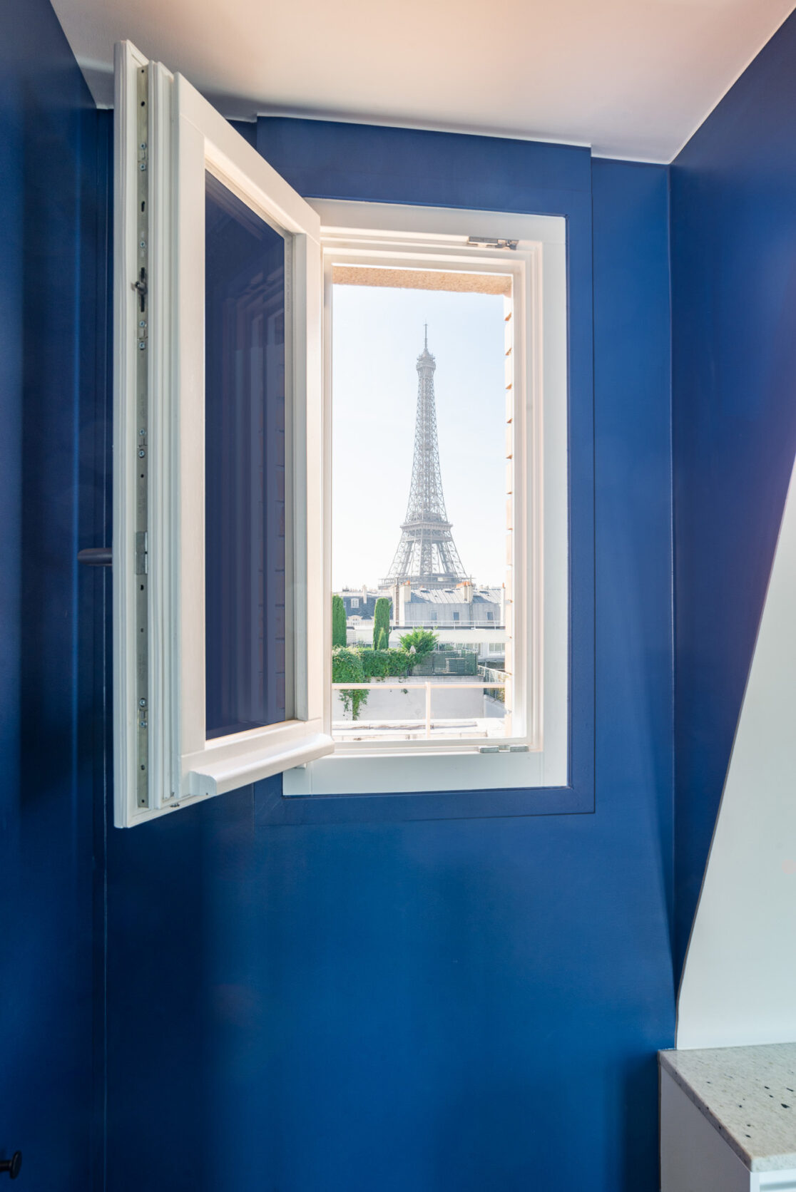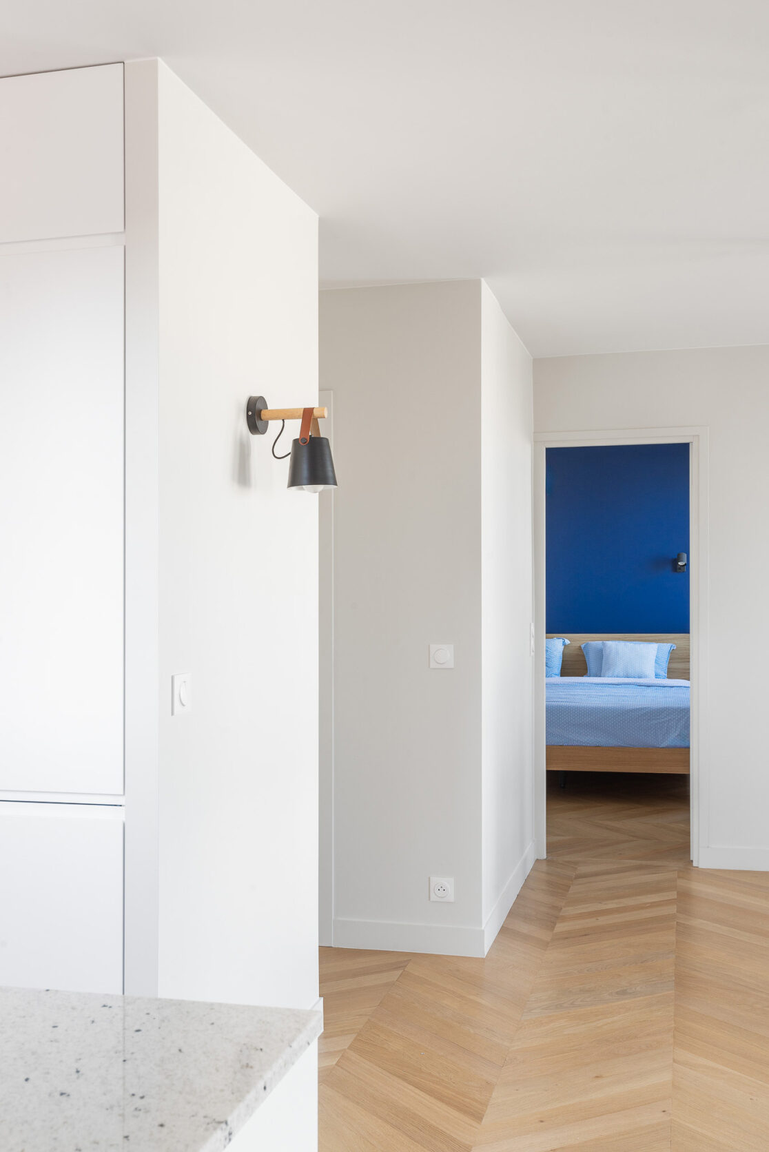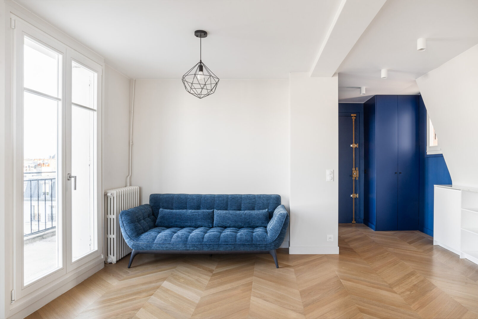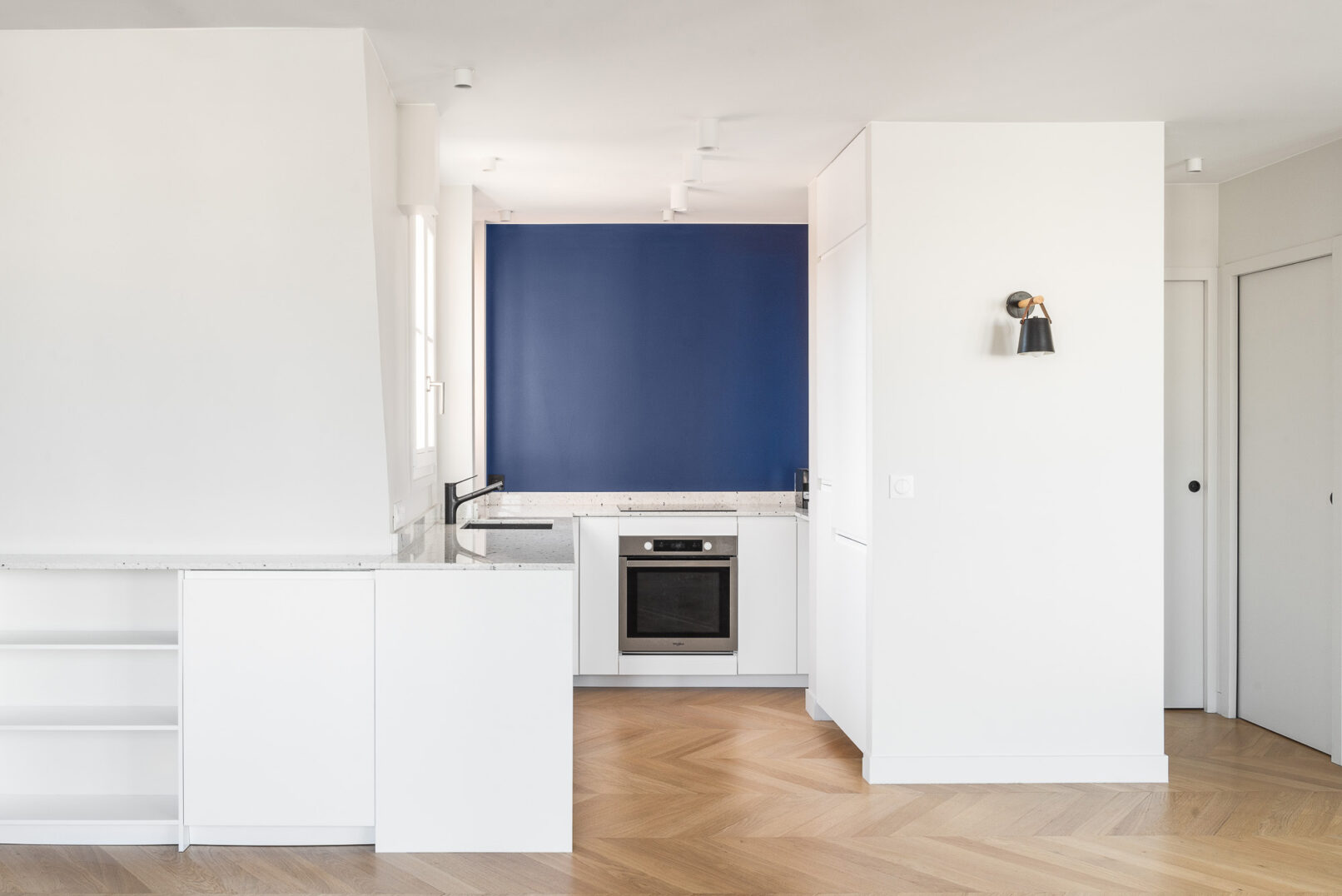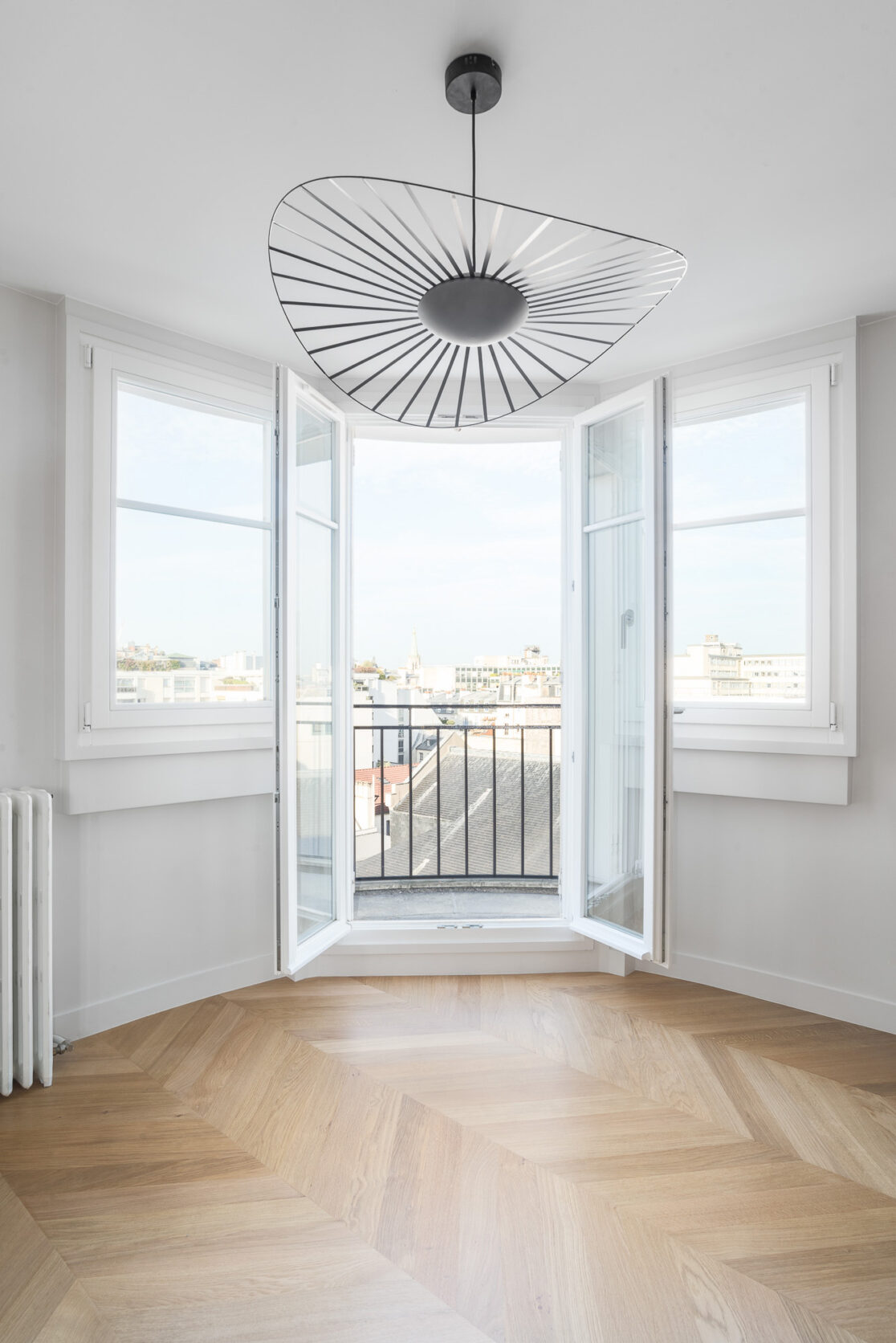 Un appartement de 70m² au dernier étage d’un immeuble dans le quartier prisé du Gros Cailloux Paris 07. Rénovation complète de l’appartement pour créer un 3 pièces de charme avec cuisine ouverte, grands volumes de vie et optimisation des espaces par la diminution des circulations.